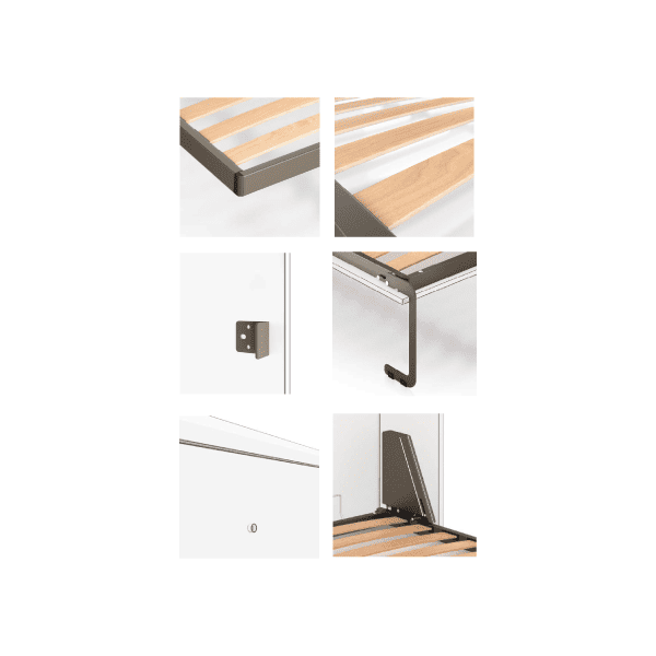Zgara ortopedike është realizuar me strukturë metalike të përforcuar në profil katror, që ofron stabilitet dhe mbështetje të fortë për dyshekun. Këmbët janë të montuara në pjesën e poshtme të zgarës dhe funksionojnë në sinkron me hapjen e krevatit, duke u palosur dhe fshehur automatikisht kur krevati mbyllet. Kjo i jep strukturës një pamje të rregullt dhe pa ndërprerje vizuale, kur krevati është në pozicion vertikal.
