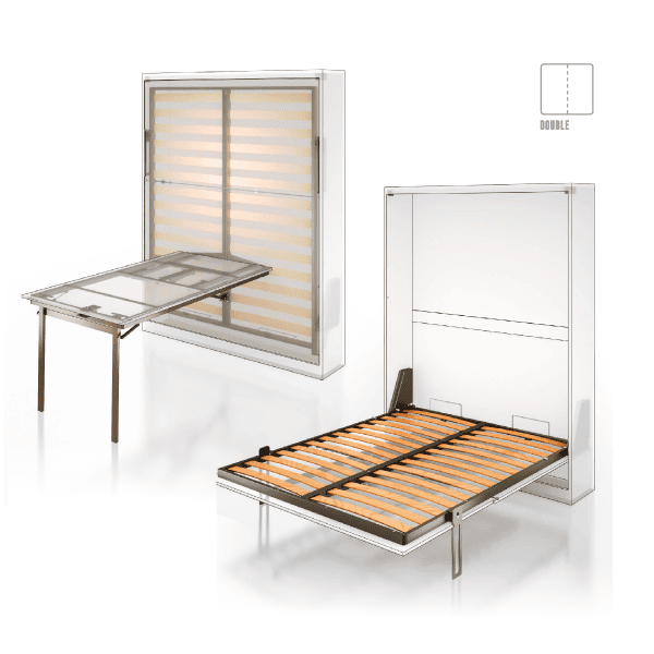 Ky sistem inovativ salvaspazio është i krijuar për të mbështetur një tavolinë palosëse me mekanizëm të tipit “portafoglio”, e cila mund të instalohet lehtësisht në të gjitha modelet e krevateve të fshehura — si ato me hapje horizontale ashtu edhe vertikale — si dhe direkt në mur.